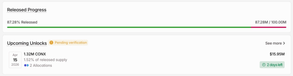Am 15. April werden 1,32 Millionen CONX in Umlauf gebracht . Aktuelle Schätzungen gehen von einem Wert von rund 15,95 Millionen US-Dollar aus . Dies entspricht 1,52 % des bereits freigegebenen Angebots.