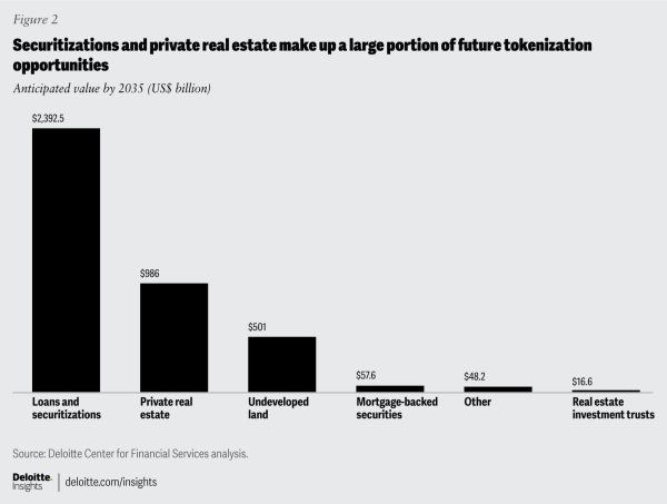 Abbildung 1. Deloitte identifizierte Kredite, Verbriefungen und private Immobilien als die größten Tokenisierungschancen der nächsten zehn Jahre. Quelle: Deloitte.