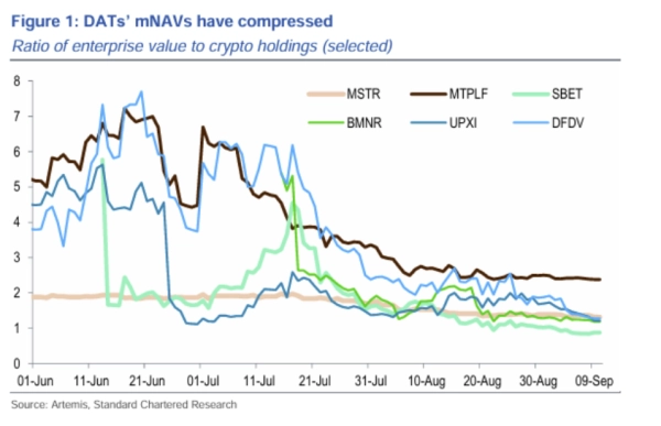 Die mNAVs der großen Krypto-Treasuries sind in den letzten Monaten gesunken. Quelle: Standard Chartered