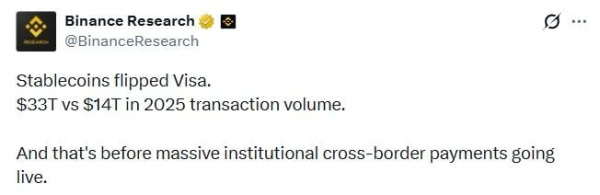 - Laut Binance Research erreichte das Transaktionsvolumen von Stablecoins 33 Billionen US-Dollar und übertraf damit Visa in absoluten Zahlen.