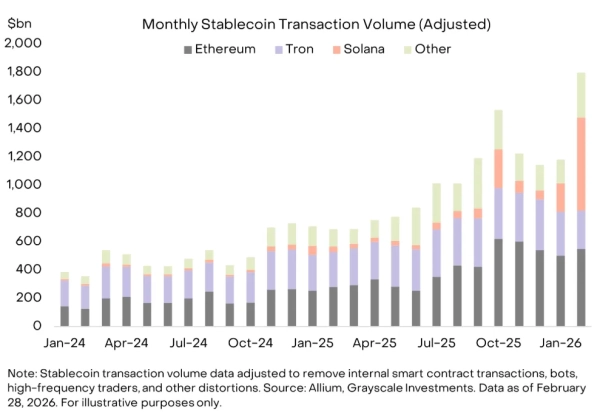 Die Entscheidung für das Netzwerk der „Volkskryptowährung“ zur Integration ist durch Markttrends gerechtfertigt. Laut Grayscale verzeichnete das Stablecoin-Segment auf Solana im Februar ein Rekordwachstum.