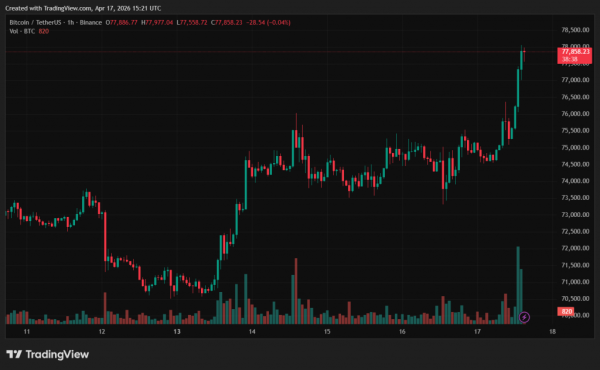 Zum Zeitpunkt der Veröffentlichung dieses Artikels notiert Bitcoin bei rund 77.900 US-Dollar. Der Kurs ist in den letzten 24 Stunden um 5 % gestiegen.