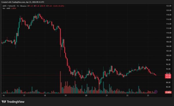 Der native Aave-Token befindet sich weiterhin im Abwärtstrend. Der AAVE-Kurs ist in der vergangenen Woche um 13,8 % gefallen. Zum Zeitpunkt der Veröffentlichung dieses Artikels notiert der Token bei rund 91,2 US-Dollar.