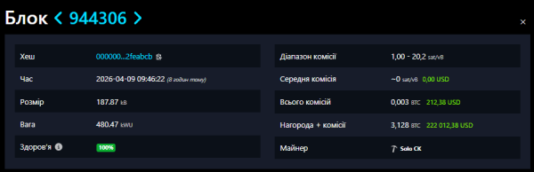Ein einzelner Miner mit einer Hashrate von nur 70 TH/s fand Block 944.306 im Bitcoin-Netzwerk. Die Belohnung betrug 3.128 BTC (222.074 US-Dollar).