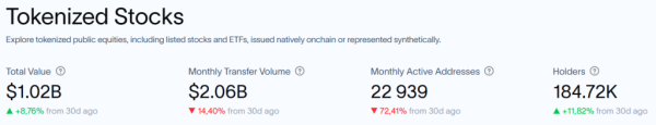 Der vollständige Start von xChange wird durch das stetige Wachstum des Segments unterstützt. Laut RWA.xyz hat der Gesamtwert des tokenisierten Aktienmarktes 1,02 Milliarden US-Dollar überschritten, ein Anstieg von 8,8 % in den letzten 30 Tagen. Die Gesamtzahl der Inhaber solcher Vermögenswerte ist um 11,8 % auf 184.720 gestiegen.