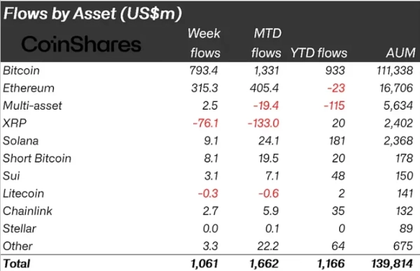 Instrumente, die auf der ersten Kryptowährung basierten, zogen 793 Millionen US-Dollar an. Innerhalb von drei Wochen erreichte der Wert 2,2 Milliarden US-Dollar und glich damit teilweise den Abfluss von 3 Milliarden US-Dollar in den vorangegangenen fünf Wochen aus. Produkte, die das Eröffnen von Short-Positionen auf Bitcoin ermöglichten, erzielten 8,1 Millionen US-Dollar.