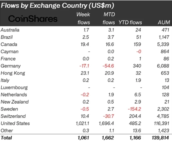Wöchentliche Verteilung des eingeworbenen Kapitals nach Regionen. Quelle: CoinShares.