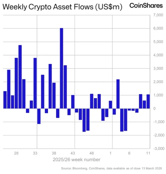 Vom 9. bis 13. März belief sich der Zufluss in Kryptowährungs-Anlageprodukte auf 1,06 Milliarden US-Dollar. Die positive Entwicklung setzt sich damit die dritte Woche in Folge fort, wie Analysten von CoinShares berichten.
