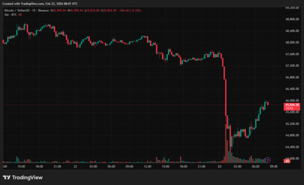 Am 23. Februar fiel der Bitcoin-Kurs innerhalb von nur zwei Stunden auf 64.435 US-Dollar. Dem Marktführer folgend, gaben auch andere digitale Währungen nach.