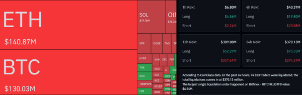 Im Laufe des Tages belief sich das Liquidationsvolumen auf dem Kryptomarkt auf 370,13 Millionen US-Dollar. Die größte erzwungene Positionsschließung wurde bei Ethereum verzeichnet (140,87 Millionen US-Dollar), wobei der Großteil der Verluste auf Leerverkäufe zurückzuführen war (122,87 Millionen US-Dollar).