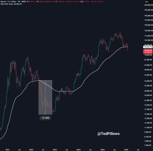 Wie Ted Pillows anmerkte, schloss Bitcoin die Woche erstmals seit Langem unter dem exponentiellen 100-Tage-Durchschnitt (100-EMA). Beim letzten Mal folgte darauf ein Kurssturz von 58 %.