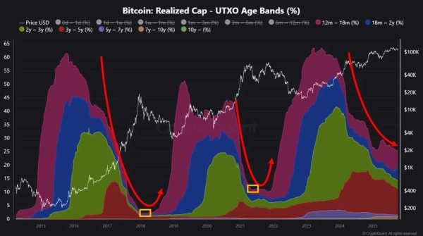 Er verwies auf das Verhalten langjähriger Bitcoin-Inhaber. Wenn sich der Wachstumszyklus seinem Höhepunkt nähert, beginnt diese Investorengruppe, den Vermögenswert aktiv zu verkaufen – insbesondere Coins, die länger als ein Jahr gehalten werden. Jetzt zeigt sich ein anderes Bild: Der Anteil „älterer“ Coins nimmt allmählich ab, was auf eine neue Wachstumsdynamik hindeutet.