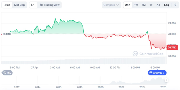 Zum Zeitpunkt der Veröffentlichung war Bitcoin laut CoinMarketCap unter 77.000 US-Dollar gefallen, während Ethereum angesichts nachlassenden kurzfristigen Optimismus unter 2.300 US-Dollar gerutscht war.