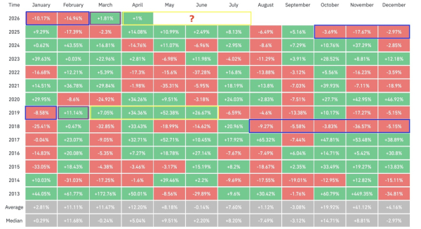 Historische Daten von CoinGlass zeigen, dass Bitcoin den Monat erstmals seit sechs Monaten im Plus abschloss. Im März stieg der Kurs nach fünf Monaten in Folge mit rückläufigen Kursen um 2 % .