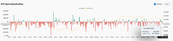Die jüngsten Zu- und Abflüsse spiegeln ebenfalls eine vorsichtige Akkumulation wider. Am 1. Oktober gab es einen moderaten positiven Abfluss von 23,23 Millionen US-Dollar in Bitcoin, was auf einen geringen kurzfristigen Verkaufsdruck hindeutet. Dennoch halten die allgemeinen Akkumulationstrends an und bestätigen einen Aufwärtstrend mittel- bis langfristig.