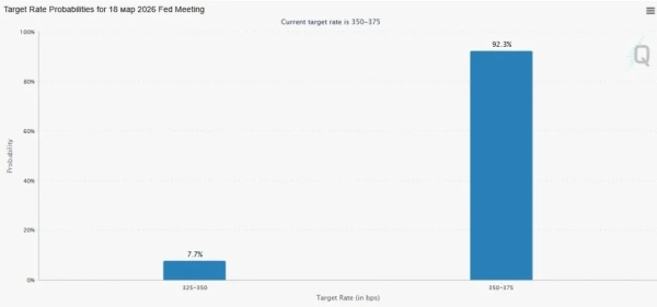 Die Märkte für Swaps und Optionen zeigen nahezu uneingeschränktes Vertrauen, dass die US-Notenbank Federal Reserve (Fed) nach ihrer Sitzung am 18. März ihren Leitzins im aktuellen Kurs von 3,5–3,75 % beibehalten wird. Die Wahrscheinlichkeit für dieses Szenario wird auf 92,3 % geschätzt. Innerhalb der letzten 24 Stunden stieg der Leitzins um 0,7 % und im vergangenen Monat um 10,7 %.