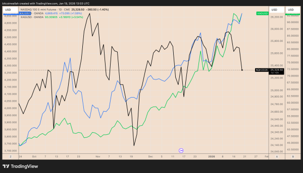 Tageschart der Nasdaq-Futures im Vergleich zu Gold und Silber. Quelle: TradingView.
