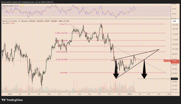 Analysten zufolge hat sich im Tageschart von Bitcoin ein „steigender Keil“ gebildet. Dies ist typischerweise ein bärisches Muster, das darauf hindeutet, dass die Käufer trotz steigender Tiefststände an Schwung verlieren.