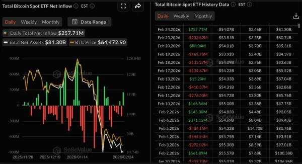 Das wiedererwachte Interesse amerikanischer Investoren wird durch die Daten von Bitcoin-ETFs bestätigt. Bis zum 24. Februar zogen diese Instrumente über 257 Millionen US-Dollar an – der höchste Stand seit Anfang Februar.