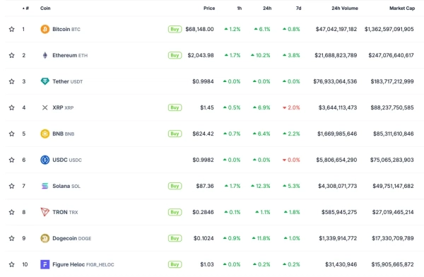 Der Kurs der führenden Kryptowährung ist in den letzten 24 Stunden um 6 % gestiegen. Zum Zeitpunkt der Veröffentlichung dieses Artikels notiert die Kryptowährung bei rund 68.400 US-Dollar.