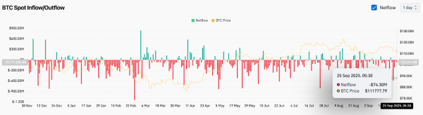 Die Daten zum Börsenfluss deuten weiterhin auf eine vorsichtige Positionierung hin. Am 25. September beliefen sich die Netto-Bitcoin-Abflüsse auf 74,3 Millionen US-Dollar, was die Präferenz der Anleger widerspiegelt, Vermögenswerte außerbörslich zu halten. Dies deutet zwar auf einen Rückgang des Verkaufsdrucks hin, weist aber auch auf die Volatilität der Spot-Nachfrage hin, da die Akkumulation noch kein nachhaltiges Niveau erreicht hat.