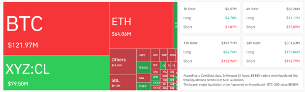 Laut Coinglass waren die Liquidationen von Bitcoin-Short-Positionen (97,9 Millionen US-Dollar) fast viermal so hoch wie die Liquidationen von Short-Positionen in den letzten 24 Stunden (24 Millionen US-Dollar).