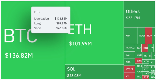 Laut CoinGlass wurden innerhalb von 24 Stunden Long-Positionen im Wert von 89,97 Millionen US-Dollar und Short-Positionen im Wert von 46,85 Millionen US-Dollar liquidiert.