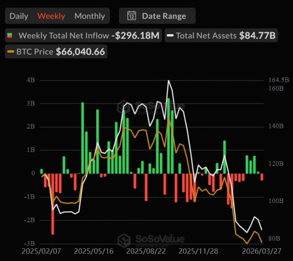 Laut SoSoValue verzeichneten Spot-ETFs mit $BTC zwischen dem 23. und 27. März Nettoabflüsse in Höhe von 296 Millionen US-Dollar, was die allgemeine Vorsicht des institutionellen Sektors in der vergangenen Woche widerspiegelt.