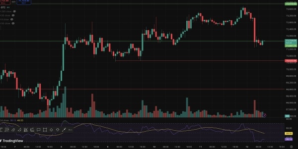 Nach jüngsten Versuchen, die Marke von 73.000 US-Dollar zu durchbrechen, geriet Bitcoin ( BTC ) unter starken externen Druck. Eine Welle lokaler Verkäufe erfasste den Markt und ließ den Kurs auf 71.600 US-Dollar zurückfallen, ein Verlust von rund 2 %.