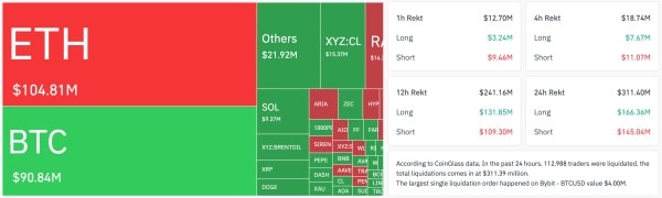 Das tägliche Liquidationsvolumen auf dem Kryptomarkt hat 311 Millionen US-Dollar überschritten. In den letzten 24 Stunden wurden die Positionen von 112.688 Händlern zwangsweise geschlossen, mit einem Gesamtvolumen von 311,28 Millionen US-Dollar. Die größte Order im Wert von 4 Millionen US-Dollar wurde an der Bybit-Börse im Währungspaar Bitcoin/US- Dollar (BTC /USD) registriert.