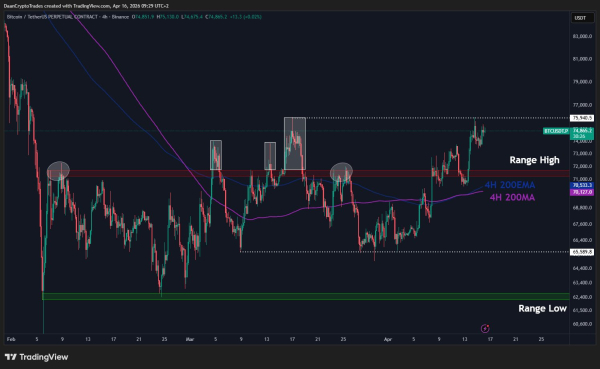 Am 16. April versuchte Bitcoin ( BTC ), die Konsolidierung unterhalb von 75.000 US-Dollar zu durchbrechen und testete dabei seine Grenzen. Der Versuch, eine Korrektur mit einem Ausbruch unter 73.600–73.800 US-Dollar einzuleiten, scheiterte jedoch an starkem Widerstand der Käufer. Bislang konnte sich der Kurs nicht über 75.000 US-Dollar konsolidieren. Am Freitagmorgen fiel der Kurs wieder unter diese psychologisch wichtige Marke.