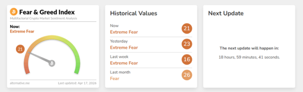 Der Fear and Greed Index sank von 23 auf 21 Punkte und verblieb damit im Bereich extremer Angst.