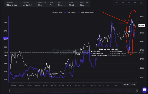 Am 23. April konsolidierte sich Bitcoin ( BTC ) um sein vorheriges mittelfristiges Hoch von 78.300 US-Dollar. Während die Käufer den Ausbruch bestätigen mussten, setzten die Verkäufer den Kampf fort. Zwischen 77.500 und 78.500 US-Dollar bildete sich ein Kurskorridor. Bis zum Handelsschluss am Donnerstag war die Entscheidung noch offen und wurde auf Freitag vertagt.