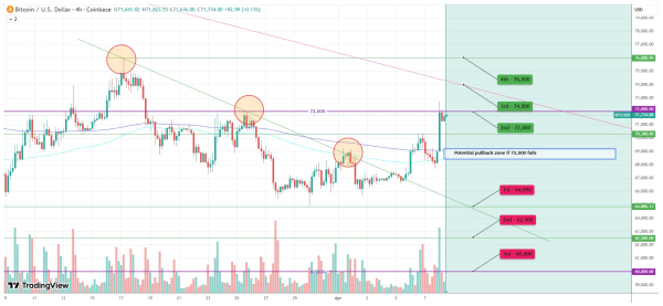 Basisszenario (bullisch): Konsolidierung über 72.000 $. Hält der Kurs dieses Niveau als Unterstützung, liegen die nächsten Kursziele bei der oberen Begrenzung des Kanals bei 74.000 $ und dem März-Hoch bei 76.000 $.