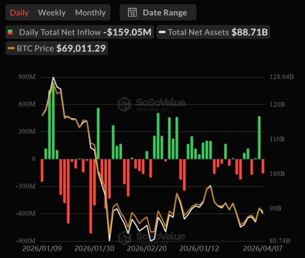 Laut SoSoValue verzeichneten Spot-Bitcoin-ETFs trotz des Preisanstiegs Abflüsse in Höhe von 159,05 Millionen US-Dollar, was auf Gewinnmitnahmen institutioneller Anleger nach den gestrigen Rekordhochs zurückzuführen sein könnte.