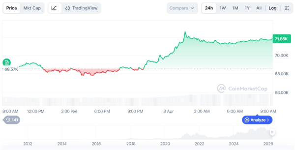 Bitcoin (BTC) stieg, durchbrach kurzzeitig die Widerstandsmarke von 72.000 US-Dollar und erreichte ein lokales Hoch von 72.694 US-Dollar. Laut CoinMarketCap legte die Kryptowährung in den letzten 24 Stunden um 4,32 % zu und erholte sich damit von einer längeren Konsolidierungsphase nahe dem unteren Ende der Handelsspanne.