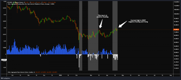 Die Finanzierungssätze an den Börsen bleiben negativ, obwohl der Bitcoin-Kurs weiter steigt – ein Phänomen, das Analysten als ungewöhnlich und potenziell bedeutsam einstufen.