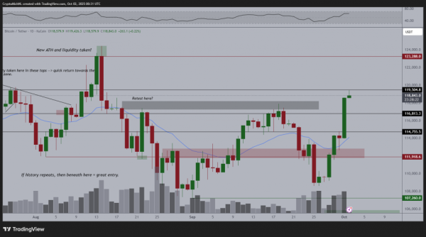 Krypto-Händler und Unternehmer Michaël van de Poppe verzeichnet einen starken Monatsstart für Bitcoin. Er glaubt, der Aufwärtstrend halte an und Rückgänge sollten als Kaufgelegenheiten genutzt werden. Der Vermögenswert habe bereits fast die gesamte Liquidität oberhalb der jüngsten Höchststände absorbiert, daher erwartet der Analyst eine gewisse Abschwächung. Dies könnte Altcoins die Möglichkeit geben, weiterhin Stärke zu zeigen, und Bitcoin könnte im Oktober sein Allzeithoch erneuern.