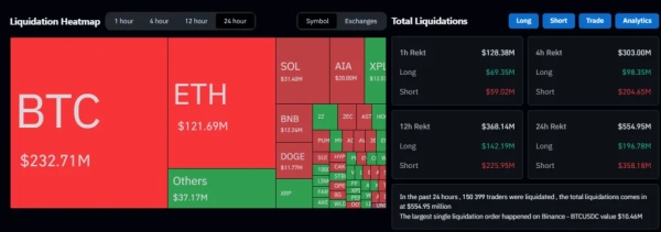 In den letzten 24 Stunden erreichte das Liquidationsvolumen auf dem Markt 554 Millionen US-Dollar, davon waren 358 Millionen US-Dollar Short-Positionen.