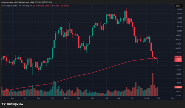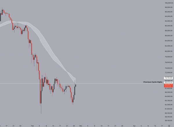 Laut Bitstamp fiel der Kurs am 26. Februar auf 67.488 US-Dollar zurück, ein Minus von 1 % gegenüber dem Vortag. Am Tag zuvor war Bitcoin auf 70.040 US-Dollar gestiegen und hatte versucht, zwei wichtige Marken zurückzuerobern: den exponentiellen gleitenden 200-Wochen-Durchschnitt (EMA) und das alte Allzeithoch aus dem Jahr 2021. Beide Versuche scheiterten.