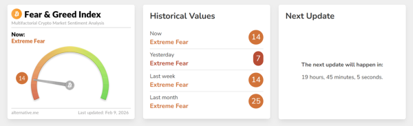 Eine ähnliche Enttäuschung spiegelt sich auch im Fear and Greed Index wider, der weiterhin im extremen Angstbereich verharrt. Vor dem Wochenende fiel der Indikator auf den niedrigsten Stand seit dem Zusammenbruch des Terra-Ökosystems (7 Punkte), hat sich aber inzwischen wieder auf 14 Punkte erholt.