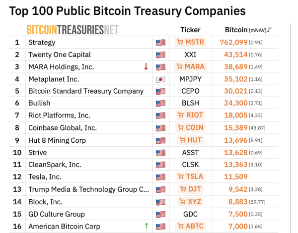 Im BitcoinTreasuries.net-Ranking liegt ABTC derzeit knapp vor Galaxy Digital, das BTC im Wert von ca. 6.894 US-Dollar hält. Das Unternehmen hat seine Reserven schneller aufgefüllt als einige größere Inhaber, obwohl es erst seit Kurzem börsennotiert ist.