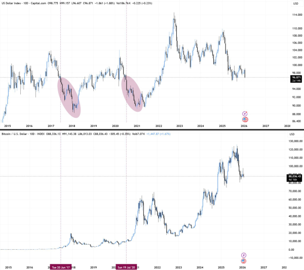 „Historisch gesehen erreichte Bitcoin seinen Tiefpunkt, sobald der DXY unter 96 fiel. Auch die beiden größten Kursanstiege der führenden Kryptowährung ereigneten sich in Phasen, in denen der Dollar-Index unter dieses Niveau sank. Nun scheint der DXY erneut kurz vor einem starken Rückgang zu stehen“, so BitBull.