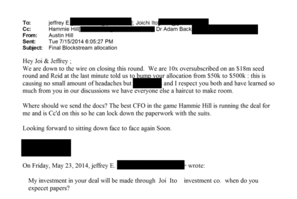 - Blockstream und sein Management tauchen in der Korrespondenz des Finanziers auf.