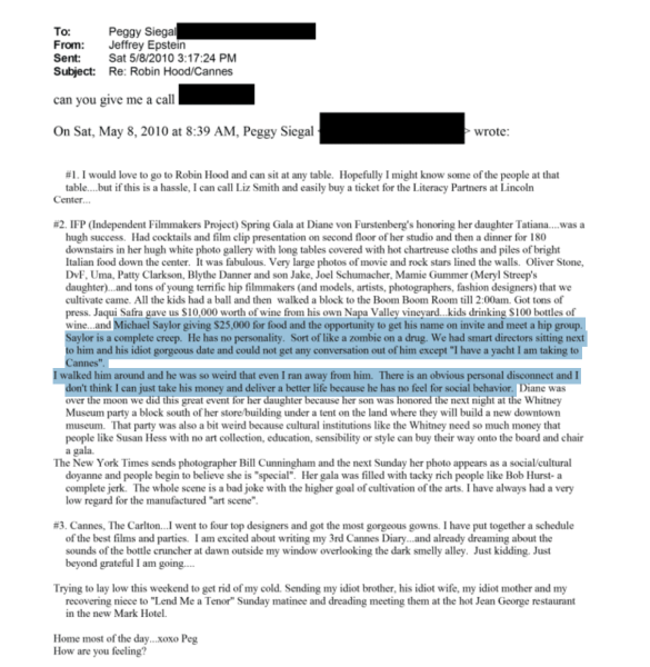 In einer E-Mail aus dem Jahr 2010 gab Saylor detailliert seine Spende von 25.000 US-Dollar an eine Wohltätigkeitsveranstaltung aus Epsteins Umfeld bekannt. Im Gegenzug soll er die Möglichkeit erhalten haben, an exklusiven Veranstaltungen teilzunehmen und Mitglieder der High Society kennenzulernen.