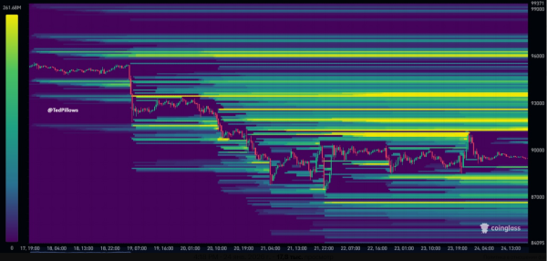 Der bekannte Kryptoexperte Ted Pillowes analysierte unterdessen die Liquiditätslage am Markt. Dieser konsolidiert aktiv unterhalb des aktuellen Preises – im Bereich von 88.000 bis 86.500 US-Dollar. Bitcoin hingegen befindet sich auf seinem Aufwärtstrend und bildet massive Cluster im Bereich von 92.000 bis 96.000 US-Dollar.
