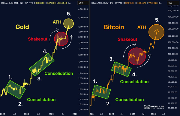 Trader Merlijn erklärte, Bitcoin folge weiterhin „dem Gold-Trick“. „Gold: Marktbereinigung vor dem Allzeithoch. Bitcoin: Gleiche Konsolidierung, gleiche Falle. Der Ausbruch ist vorprogrammiert. Nächster Halt: Fair-Price-Finding-Modus“, schrieb er in den sozialen Medien.