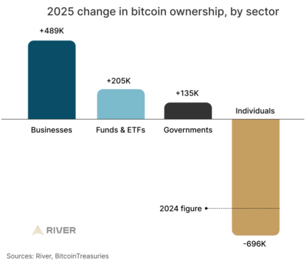Laut River erreichte der Bitcoin-Bestand in Privatbesitz 2024 seinen Höhepunkt. 2025 setzte ein Abfluss ein, wobei Privatpersonen ihre Bestände um 696.000 BTC reduzierten. Im gleichen Zeitraum erhöhten Unternehmen ihre Bestände um 489.000 BTC , Fonds und ETFs um 205.000 BTC und Regierungen um 135.000 BTC . Insgesamt deutet dieser stabile Trend darauf hin, dass Bitcoin zu einem immer beliebteren Finanzinstrument wird.