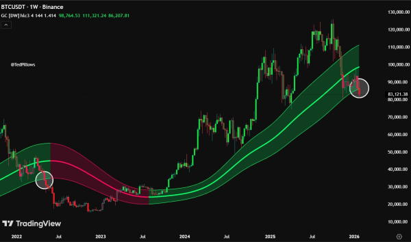 Aus technischer Sicht ist das Bild besorgniserregend. Ted Pillowes merkt an, dass Bitcoin unter seinen wöchentlichen Gaußschen Kanal gefallen ist. Er fasst die Situation wie folgt zusammen: