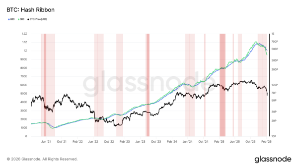 Der Hash Ribbons-Indikator gab ebenfalls Anlass zur Sorge: Die durchschnittliche Hashrate der letzten 30 Tage fiel unter den Durchschnitt der letzten 60 Tage – eine negative Inversion, die historisch gesehen auf erhebliche Schwierigkeiten bei den Einnahmen der Miner hinweist und das Risiko einer Kapitulation erhöht.